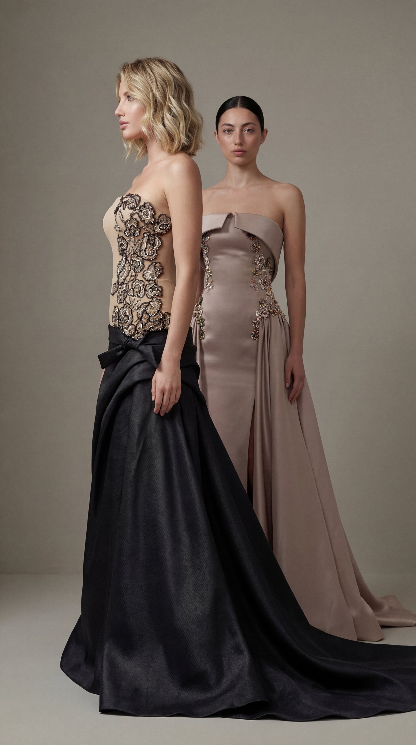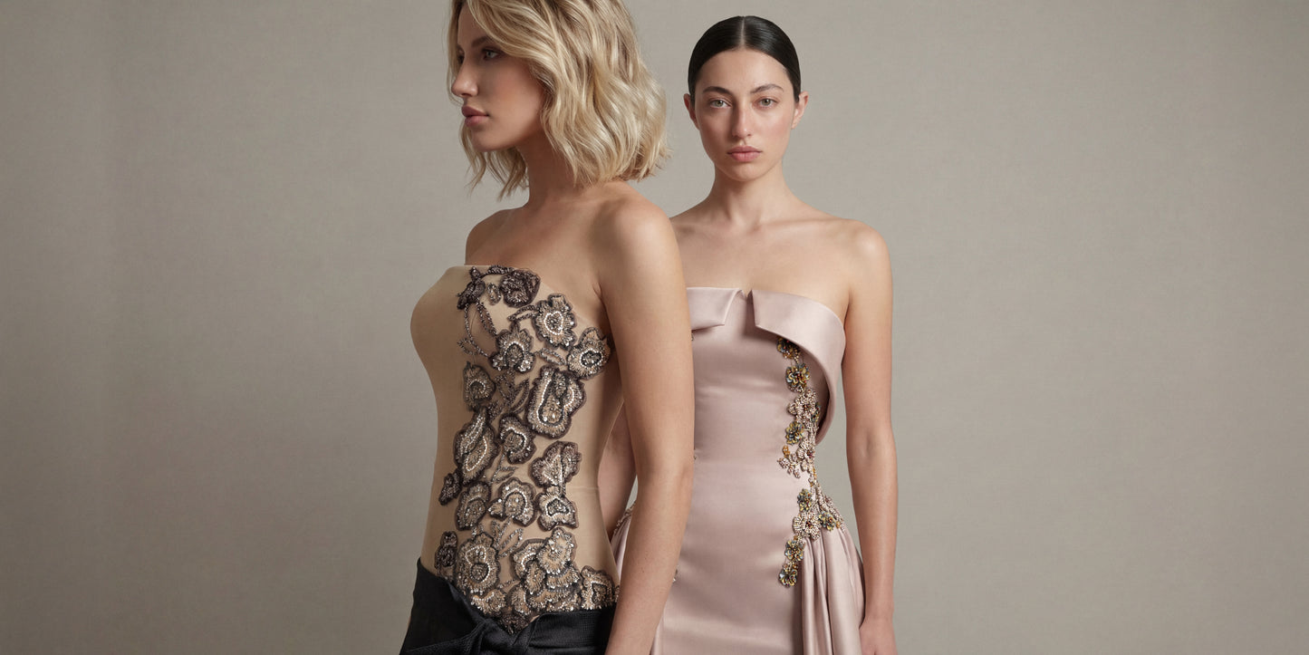 A poetic dialogue between structure and fluidity where refined tailoring meets ethereal movement.